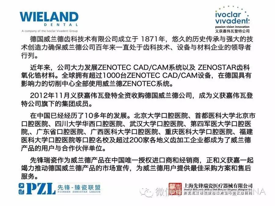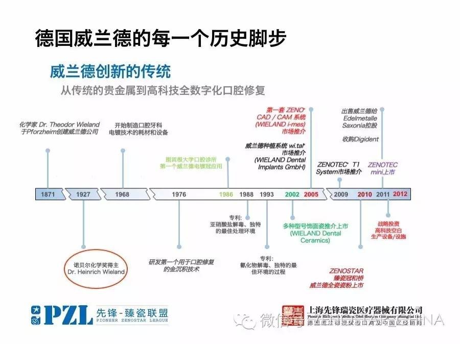 透過德國威蘭德一百多年的發(fā)展歷史,從諾貝爾化學獎到口腔金沉積技術(shù)的研發(fā)和應(yīng)用,德國威蘭德的每一步始終走在了口腔技工行業(yè)的最前端。擁有最先進的氧化鋯生產(chǎn)工藝及氧化鋯圓盤的行業(yè)專利標準和獨有的染色工藝,使德國威蘭德必定成為口腔義齒加工技術(shù)的主導者和締造者。
